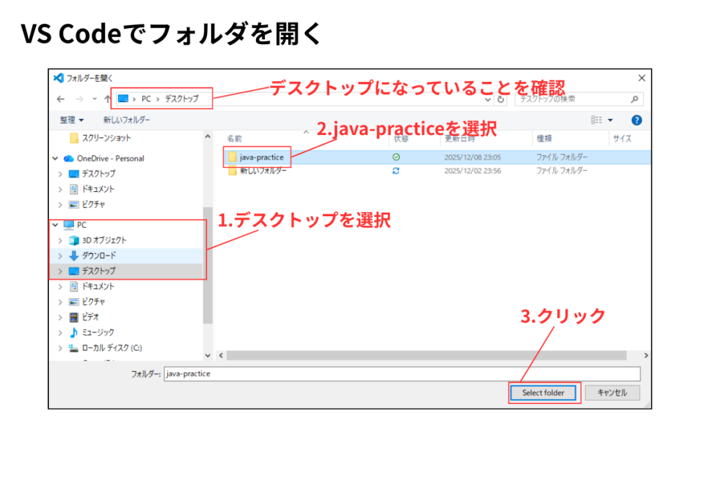 - デスクトップの中にある「java-practice」フォルダを選択